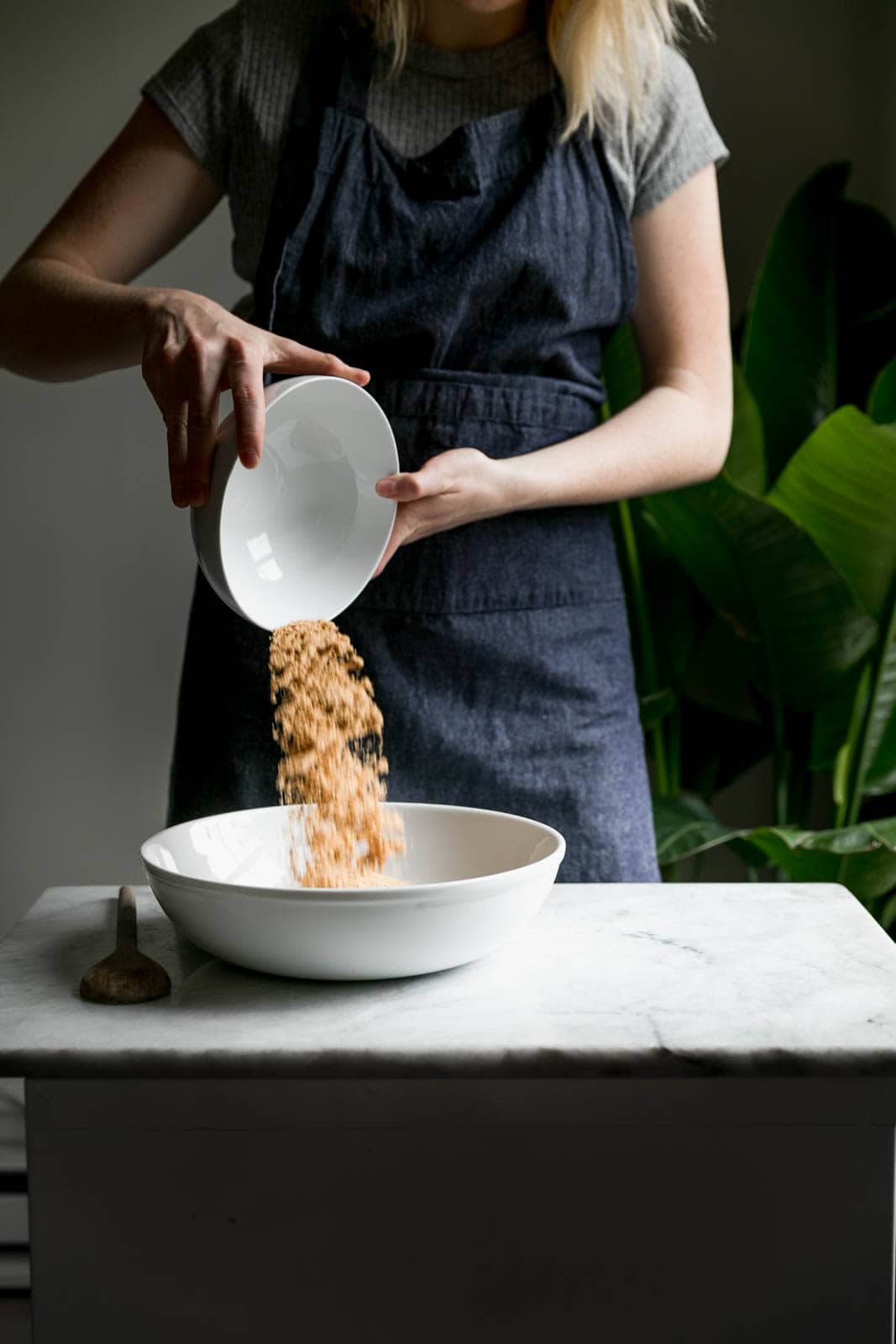 - In a large bowl, combine the graham cracker crumbs, finely ground almonds, and brown sugar, stirring to combined.