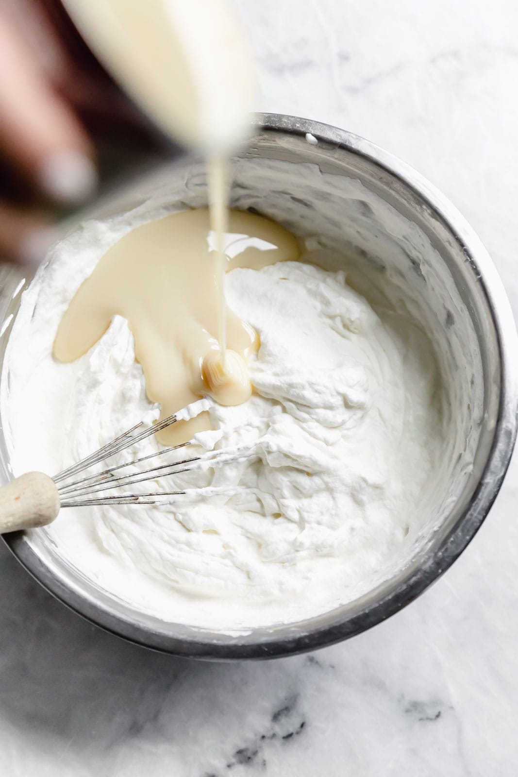 - Pour the sweetened condensed milk on top of the cream and fold gently until everything comes together.
